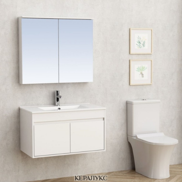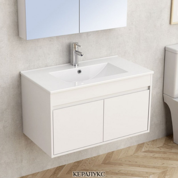 Влагоустойчив шкаф за баня с бяла керамична мивка и две вратички.