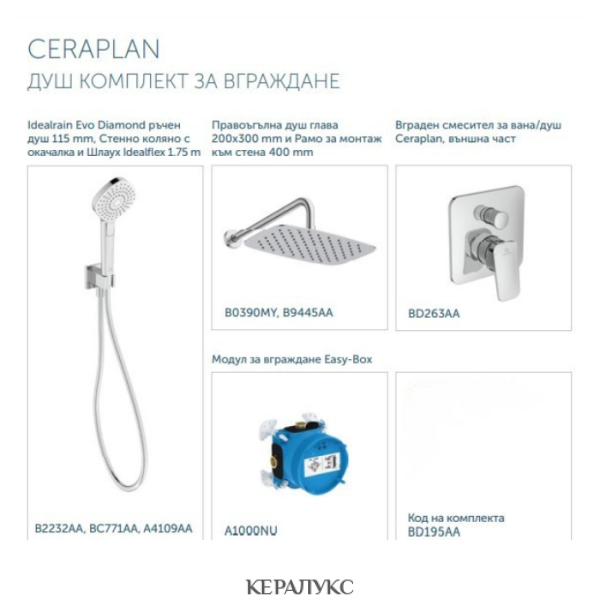 Душ комплект за вграждане CERAPLAN включва: